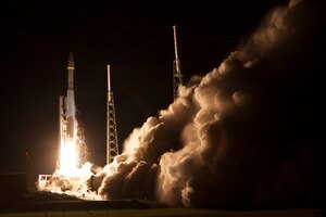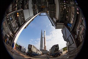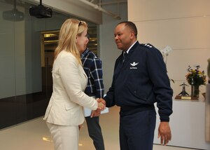U. S. Air Force Lt. Gen. Sam Greaves, Space and Missile Systems Center commander, meets with Gwynne Shotwell, president of Space Exploration Technologies Corp., before a tour of SpaceX's Hawthorne, Calif., facility Aug. 7, 2014. (U.S. Air Force photo by Sarah Corrice)
