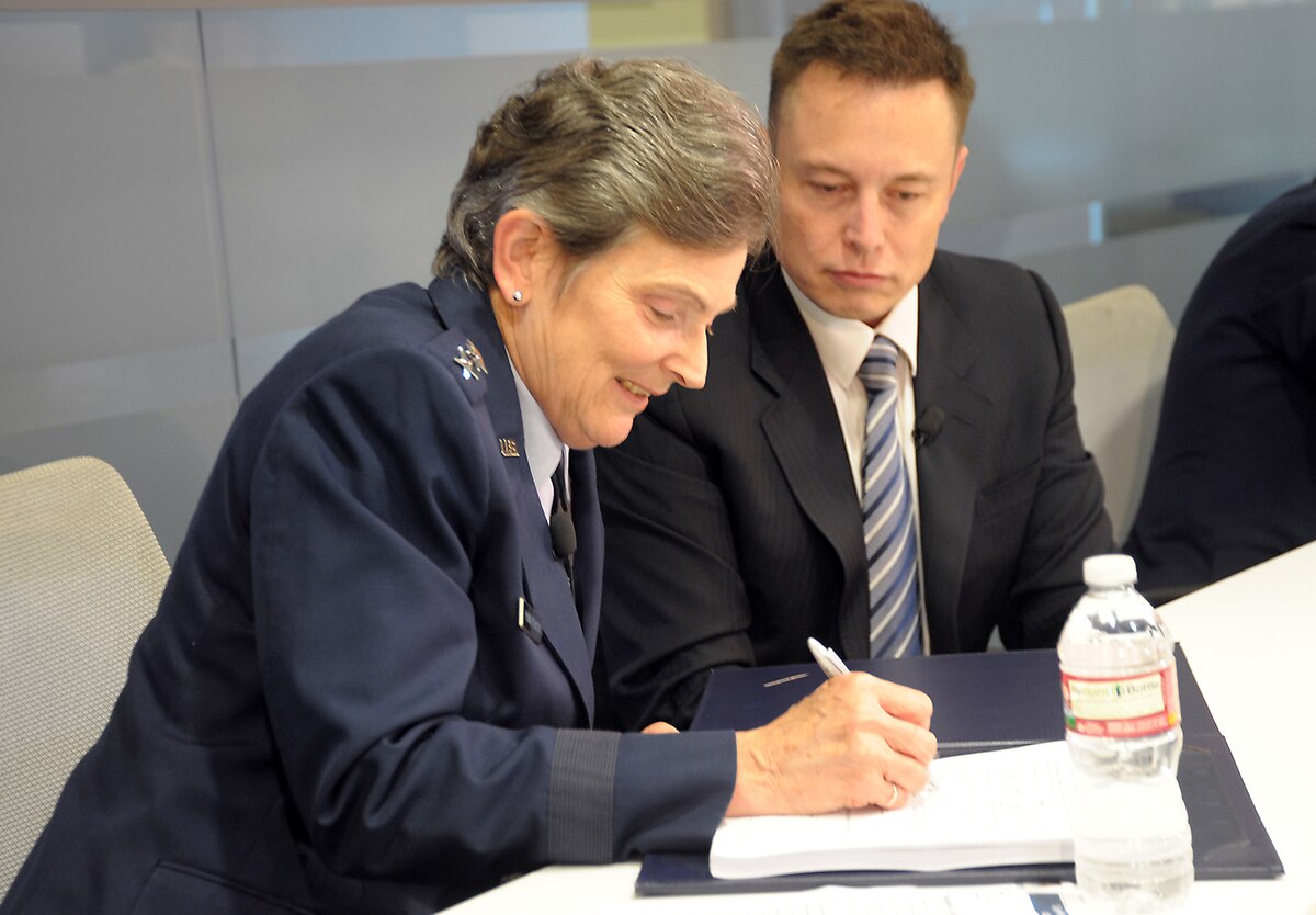 Lieutenant General Ellen Pawlikowski, SMC commander, and Elon Musk, SpaceX CEO, sign a Cooperative Research and Development Agreement to certify the Falcon 9 v1.1 Launch System for National Security Space missions at a ceremony, June 7. The CRADA will be in effect until all certification activities are complete. While certification does not guarantee a contract award, it does enable a company to compete for launch contracts. (Photo by Joe Juarez)